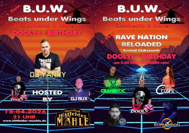 Beats under Wings Club Beats & More ‼️Samstag- 18.04.2026‼️ Die Nacht wird laut, die Nacht wird heiß! Wir spielen euch revival Clubsounds höchster Güte! 📍Diskothek Hittfelder Mühle Weg zur Mühle 10, 21218 Seevetal 🕒 Start: 21:00 Uhr ====================== EUCH erwartet: ★ DJ YANNY ★ DJ BUX ★ DJ DOOLY ★ CRANEDOC ★ WOPIMUSIC ★ CRUSHI ★EUPHORION ====================== 🔻🔻🔻🔻🔻🔻🔻🔻🔻🔻🔻🔻🔻 ✖️ TICKETS ✖️ An der Abendkasse 🎟️ ► Eintritt 15,00€ ★HINWEISE ZUM EINLASS ★ 🔸► ab 21:00 Uhr und 16 Jahren* (*ein gültiger PFÜ muss vorliegen) ◾️◾️◾️WICHTIG◾️◾️◾️◾️ Die Party ist ab 16 Jahren mit PFÜ (Muttizettel) und einem gültigen Personalausweis oder Reisepass. Alternative Ausweismöglichkeiten wie Führerschein oder Schülerausweise etc. gelten nicht. Maximal darf eine volljähriger Person mit den entsprechenden Muttizetteln, 2 minderjährige Personen beaufsichtigen. ➖➖➖➖➖➖➖➖➖➖➖➖➖➖ #hittfeldermühle #party #music #friends #WEEKEND
